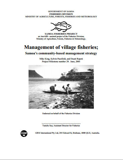 King, M., Passfield, K. and Ropeti, R.  2001. Management of Village Fisheries: Samoa’s Community-based Management Strategy.