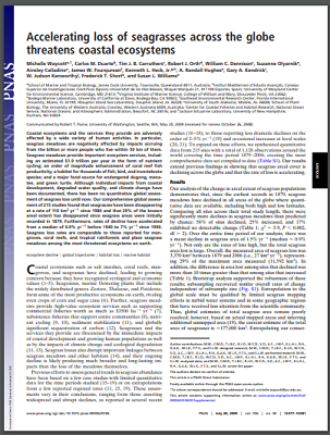 Coastal ecosystems and the services they provide are adversely affected by a wide variety of human activities. In particular, seagrass meadows are negatively affected by impacts accruing from the billion or more people who live within 50 km of them. Seagrass meadows provide important ecosystem services, including an estimated $1.9 trillion per year in the form of nutrient cycling; an order of magnitude enhancement of coral reef fish productivity; a habitat for thousands of fish, bird, and invertebrate species; and a major food source for endangered dugong, manatee, and green turtle. Although individual impacts from coastal development, degraded water quality, and climate change have been documented, there has been no quantitative global assessment of seagrass loss until now. Our comprehensive global assessment of 215 studies found that seagrasses have been disappearing at a rate of 110 km2 yr1 since 1980 and that 29% of the known areal extent has disappeared since seagrass areas were initially recorded in 1879. Furthermore, rates of decline have accelerated from a median of 0.9% yr1 before 1940 to 7% yr1 since 1990. Seagrass loss rates are comparable to those reported for mangroves, coral reefs, and tropical rainforests and place seagrass meadows among the most threatened ecosystems on earth.