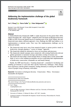 A Global Biodiversity Framework (GBF) is under discussion for the period 2021–2030, which will replace the ‘‘Aichi Targets’’ adopted by the Convention on Biological Diversity (CBD) in 2010. Given the limited success in meeting most of the Aichi Targets, this new framework must adopt a different approach. A key challenge the GBF must address is its implementation at national scales. Four ways this implementation challenge can be addressed include: