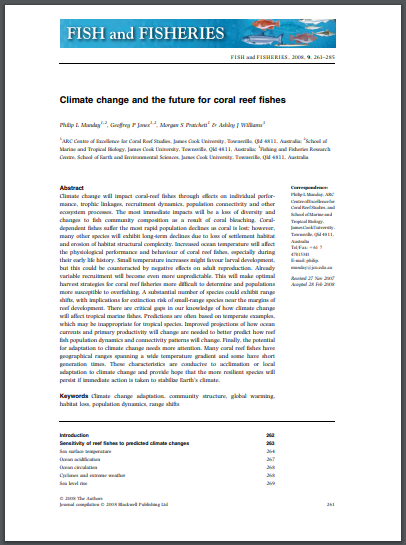 Climate change will impact coral-reef fishes through effects on individual performance, trophic linkages, recruitment dynamics, population connectivity and other ecosystem processes. The most immediate impacts will be a loss of diversity and changes to fish community composition as a result of coral bleaching. Coral-dependent fishes suffer the most rapid population declines as coral is lost; however, many other species will exhibit long-term declines due to loss of settlement habitat and erosion of habitat structural complexity. Increased ocean temperature will affect the physiological performance and behaviour of coral reef fishes, especially during their early life history. Small temperature increases might favour larval development, but this could be counteracted by negative effects on adult reproduction. Already variable recruitment will become even more unpredictable. This will make optimal harvest strategies for coral reef fisheries more difficult to determine and populations more susceptible to overfishing. A substantial number of species could exhibit range shifts, with implications for extinction risk of small-range species near the margins of reef development. There are critical gaps in our knowledge of how climate change will affect tropical marine fishes. Predictions are often based on temperate examples, which may be inappropriate for tropical species. Improved projections of how ocean currents and primary productivity will change are needed to better predict how reef fish population dynamics and connectivity patterns will change. Finally, the potential for adaptation to climate change needs more attention. Many coral reef fishes have geographical ranges spanning a wide temperature gradient and some have short generation times. These characteristics are conducive to acclimation or local adaptation to climate change and provide hope that the more resilient species will persist if immediate action is taken to stabilize Earth’s climate.