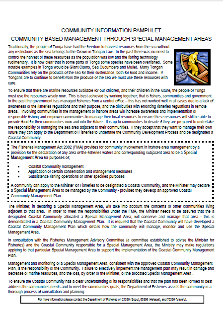 This pamphlet is a brief explanation of the process used in Tonga to establish ‘Coastal Communities’ and ‘special management areas’ through the Department of Fisheries. Following unsuccessful attempts to manage coastal activities from the Central Government, the Fisheries Management Act 2002 (FMA) now provides for community involvement in inshore area management by a provision for the declaration of any area of the fisheries waters and corresponding adjacent area to be a Special Management Area for purposes of coastal community management, application of certain conservation and management measures, subsistence fishing operations or other specified purposes.