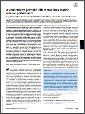 Well-managed and enforced no-take marine reserves generate important larval subsidies to neighboring habitats and thereby contribute to the long-term sustainability of fisheries. However, larval dispersal patterns are variable, which leads to temporal fluctuations in the contribution of a single reserve to the replenishment of local populations. Identifying management strategies that mitigate the uncertainty in larval supply will help ensure the stability of recruitment dynamics and minimize the volatility in fishery catches. Here, we use genetic parentage analysis to show extreme variability in both the dispersal patterns and recruitment contribution of four individual marine reserves across six discrete recruitment cohorts for coral grouper (Plectropomus maculatus) on the Great Barrier Reef. Together, however, the asynchronous contributions from multiple reserves create temporal stability in recruitment via a connectivity portfolio effect. This dampening effect reduces the variability in larval supply from individual reserves by a factor of 1.8, which effectively halves the uncertainty in the recruitment contribution of individual reserves. Thus, not only does the network of four marine reserves generate valuable larval subsidies to neighboring habitats, the aggregate effect of individual reserves mitigates temporal fluctuations in dispersal patterns and the replenishment of local populations. Our results indicate that small networks of marine reserves yield previously unrecognized stabilizing benefits that ensure a consistent larval supply to replenish exploited fish stocks.