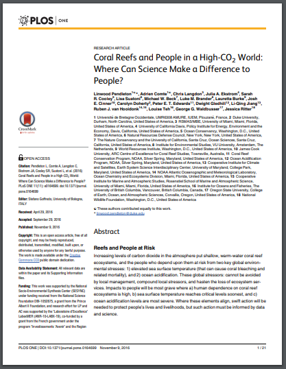Increasing levels of carbon dioxide in the atmosphere put shallow, warm-water coral reef ecosystems, and the people who depend upon them at risk from two key global environmental stresses: 1) elevated sea surface temperature (that can cause coral bleaching and related mortality), and 2) ocean acidification. These global stressors: cannot be avoided by local management, compound local stressors, and hasten the loss of ecosystem services. Impacts to people will be most grave where a) human dependence on coral reef ecosystems is high, b) sea surface temperature reaches critical levels soonest, and c) ocean acidification levels are most severe. Where these elements align, swift action will be needed to protect people’s lives and livelihoods, but such action must be informed by data and science.