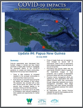 Papua New Guinea (PNG), the largest of the Pacific island nations (population 8.9 million), has not been spared from the COVID-19 pandemic. The government declared a State of Emergency in March, closing off international borders and suspending domestic air travel. Schools were closed, non-essential workers requested to stay at home, and travel between provinces limited to cargo, medicine and security personnel. The general population has been significantly affected and documenting these effects can assist in determining the best way forward for coastal communities in rural PNG. A rapid response survey questionnaire was designed to investigate the initial effects the COVID-19 pandemic has had on coastal and island communities. Staff from the Papua New Guinea Centre for Locally Managed Areas (PNG CLMA) in Central Province (popn. 270,000) and the Wildlife Conservation Society Papua New Guinea program (WCS PNG) in New Ireland Province (popn. 194,000) conducted interviews with male, female and youth key informants to gather more information on impacts that may be associated factors arising from the COVID-19 pandemic. Forty-six respondents were interviewed from fourteen villages in Central and New Ireland provinces in Papua New Guinea to investigate the associated effects of the COVID-19 pandemic on coastal and island communities.