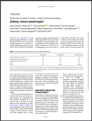 Setting targets for addressing major planetary concerns is an essential prerequisite for concerted global action (both inside and outside multilateral environmental agreements) and is necessarily a societal and political process, requiring negotiation and convergence among oftenconflicting interests. There is no such thing as a ‘scientific target’ applied in policy or business—operational targets are socio-political choices. However, this is not to say that targets cannot be ‘science-based’. What, then, does it mean for a target for addressing major planetary concerns to be ‘science-based’? First, recall that ‘science’ is ‘the organised, systematic enterprise that gathers knowledge about the world and condenses the knowledge into testable laws and principles’. Building from this, we propose the following characteristics as defining ‘science-based targets’...