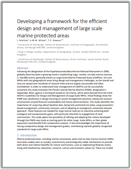 This study identifies the importance of: acquiring robust baseline data, being fully protected (no-take), using ecosystembased management, community inclusion, and of adopting an ecologically connected network approach. These features are needed for large marine reserves to maximize achieving both ecological and socioeconomic goals, with particular attention to engagement of local communities. This study opens the possibility of refining and adapting the criteria developed through the PIMR case study as starting point for other Large- Scale MPAs, as their global expansion could benefit from comparative analysis. It also acknowledges the importance of having comparative design and management guides, contributing towards globally recognized standards for large-scale MPAs.