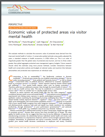 We evaluate methods to calculate the economic value of protected areas derived from the improved mental health of visitors. A conservative global estimate using quality-adjusted life years, a standard measure in health economics, is US$6 trillion p.a. This is an order of magnitude greater than the global value of protected area tourism, and two to three orders greater than global aggregate protected area management agency budgets. Future research should: refine this estimate using more precise methods; consider interactions between health and conservation policies and budgets at national scales; and examine links between personalities and protected area experiences at individual scale.