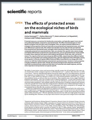Protected areas are a cornerstone for biodiversity conservation, and typically support more natural and undisturbed habitats compared to unprotected lands. The effect of protected areas on intra-specific ecological niche has been rarely investigated. Here, we explore potential differences in ecological niche properties of birds and mammals across protected and unprotected areas, and relate such differences to species traits. We combine two decades of survey data of birds and mammals from protected and unprotected areas, and apply robust matching to obtain a set of environmentally comparable protected and unprotected sites. Next, we calculate intra-specific niche volume change and habitat shift between protected and unprotected areas, and use generalized linear mixed models to explain these responses with species traits (habitat specialization, body mass, diet, and red list status).
