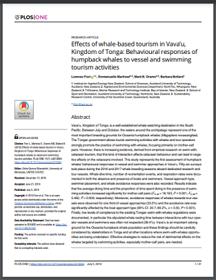 Vava’u, Kingdom of Tonga, is a well-established whale-watching destination in the South Pacific. Between July and October, the waters around the archipelago represent one of the most important breeding grounds for Oceania humpback whales (Megaptera novaeangliae). The Tongan government allows tourist swimming activities with whales and tour operators strongly promote the practice of swimming-with-whales, focusing primarily on mother-calf pairs. However, there is increasing evidence, derived from empirical research on swim-withcetacean tourism, that this kind of interaction affects cetacean behaviour and can lead to negative effects on the cetaceans involved. This study represents the first assessment of humpback whales’ behavioural responses to vessel and swimmer approaches in Vava’u...Vava’u is an important calving ground for the Oceania humpback whale population and these findings should be carefully considered by stakeholders in Tonga and at other locations where swim-with-whales opportunities are being undertaken. Effective strategies to reduce the risk of detrimental effects on the whales targeted by swimming activities, especially mother-calf pairs, are needed.