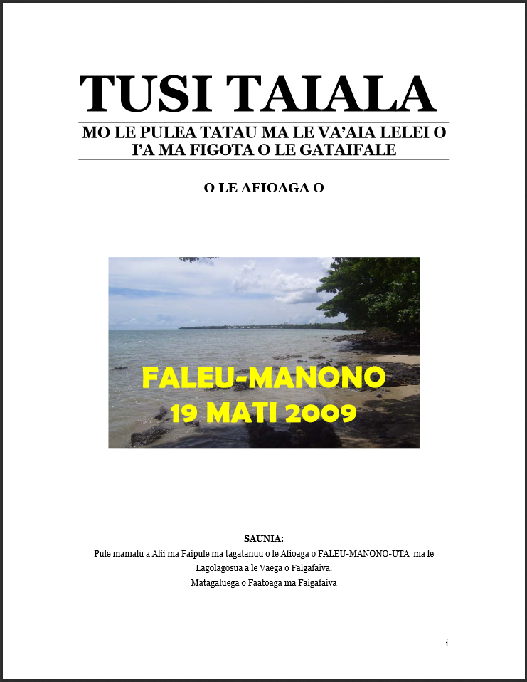 O fuafuaga faataatitia i lenei Tusi Taiala e unaia ai le vaai a lelei aemaise le pulea ma le fuafua tatau o le faaaogaina o le tamaoaiga o le gataifale ma le siosiomaga o FALEU-MANONO.