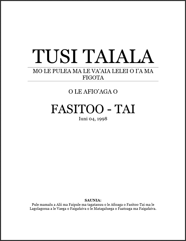 O Fasitoo-Tai e i ai ona tulafono i aso ua mavae e faasaina ai faigafaiva-le-talafeagai e pei o fanaia, ava-niu-kini, vailaau oona, lama moli-uila ma tane maulu (scuba gears) ua matua faasaina ona toe vaaia.