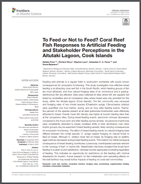 Feeding wild animals is a regular habit in ecotourism worldwide with poorly known consequences for ecosystem functioning. This study investigates how effective bread feeding is at attracting coral reef fish in the South Pacific, which feeding groups of fish are most attracted, and how natural foraging rates of an omnivorous and a grazingdetritivorous fish are affected. Data were collected at sites where fish are regularly fed bread by snorkellers and at comparison sites where bread was only provided for this study, within the Aitutaki lagoon (Cook Islands). The fish community was censused and foraging rates of two model species (Chaetodon auriga, Ctenochaetus striatus) were quantified one hour before, during, and an hour after feeding events. Twentyfive percent of the species present at all sites (piscivores-invertivores) were effectively attracted to bread. Overall, mean fish density was higher at tourism feeding sites than at the comparison sites. During bread feeding events, taxonomic richness decreased, compared to the hours prior and after feeding across all sites. As piscivore-invertivores were consistently attracted to bread, localized shifts in their dominance over other trophic groups may be expected if bread feeding persists, likely carrying consequences for ecosystem functioning.