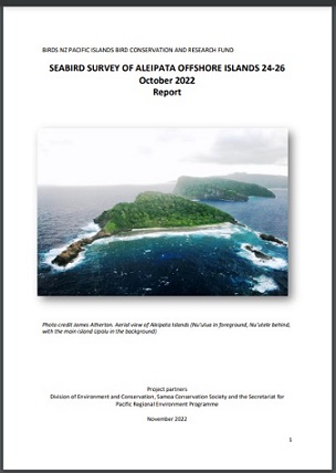 The Aleipata group of offshore islands have been identified as one of eight Key Biodiversity Areas (KBAs) in Samoa. They are located at the south-eastern end of Upolu Island at 14o3’447.28”S, 171o25’23.84”W (Nu’utele) and 14o4’22.11”S and 171o24’36.17”W (Nu’ulua) offshore. This project updates population estimates and establish baseline data and information on breeding seabirds of the Aleipata offshore islands and investigate the feasibility of future tracking studies of some species. There are four islands included in the group Nu’utele (108ha), Nu’ulua (25ha), Namua (15ha) and the smallest island Fanuatapu (6ha). All islands are under the jurisdiction of the Aleipata Marine Protected Area Committee which is made up of eleven communities of Aleipata district. These communities have customary rights over these islands. The islands are rich in biodiversity and both marine and terrestrial ecosystems support significant populations of seabirds...