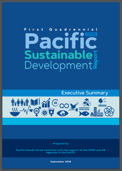 This Pacific Sustainable Development Report 2018 (PSDR) is the first quadrennial Pacific progress report on sustainable development. The report outlines high level trends on progress to date, as well as baseline information. The regional report complements national monitoring and reporting and since 2015, three Pacific Islands Forum member countries (Samoa, Kiribati and Australia), have completed their Voluntary National Review processes, and reported to the High Level Political Forum on Sustainable Development. (HLPF). Fiji, Nauru, New Zealand, Palau, Tonga and Vanuatu are reporting to the 2019 HLPF on sustainable development. The PSDR 2018 highlights the need for increasing the pace of progress towards the achievement of the 2030 Agenda. It emphasises increasing vulnerabilities through deepening inequalities, and limited access to infrastructure and basic services. The report also emphasises significant opportunities for accelerating our development, including through Pacific specific “know-how” - our ability to adapt to changing situations, our significant biodiversity and oceanic resources, and our ability to work as a Blue Pacific collective. The report reflects on the increasing access to and use of ICT and connectivity such as through more aviation routes. The report reinforces the value of shared stewardship of the Pacific Ocean, and reaffirms the connection of Pacific peoples with each other, and with their natural resources, environment, culture and livelihoods