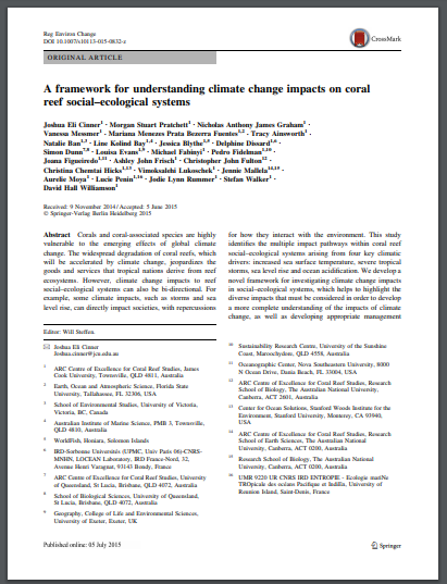 Corals and coral-associated species are highly vulnerable to the emerging effects of global climate change. The widespread degradation of coral reefs, which will be accelerated by climate change, jeopardizes the goods and services that tropical nations derive from reef ecosystems. However, climate change impacts to reef social–ecological systems can also be bi-directional. For example, some climate impacts, such as storms and sea level rise, can directly impact societies, with repercussions for how they interact with the environment. This study identifies the multiple impact pathways within coral reef social–ecological systems arising from four key climatic drivers: increased sea surface temperature, severe tropical storms, sea level rise and ocean acidification. We develop a novel framework for investigating climate change impacts in social–ecological systems, which helps to highlight the diverse impacts that must be considered in order to develop a more complete understanding of the impacts of climate change, as well as developing appropriate management.
