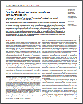 Marine megafauna, the largest animals in the oceans, serve key roles in ecosystem functioning. Yet, one-third of these animals are at risk of extinction. To better understand the potential consequences of megafaunal loss, here we quantify their current functional diversity, predict future changes under different extinction scenarios, and introduce a new metric [functionally unique, specialized and endangered (FUSE)] that identifies threatened species of particular importance for functional diversity. Simulated extinction scenarios forecast marked declines in functional richness if current trajectories are maintained during the next century (11% globally; up to 24% regionally), with more marked reductions (48% globally; up to 70% at the poles) beyond random expectations if all threatened species eventually go extinct. Among the megafaunal groups, sharks will incur a disproportionate loss of functional richness. We identify top FUSE species and suggest a renewed focus on these species to preserve the ecosystem functions provided by marine megafauna.