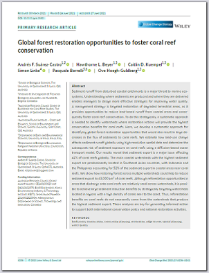 Sediment runoff from disturbed coastal catchments is a major threat to marine ecosystems. Understanding where sediments are produced and where they are delivered enables managers to design more effective strategies for improving water quality. A management strategy is targeted restoration of degraded terrestrial areas, as it provides opportunities to reduce land-based runoff from coastal areas and consequently foster coral reef conservation. To do this strategically, a systematic approach is needed to identify watersheds where restoration actions will provide the highest conservation benefits for coral reefs. Here, we develop a systematic approach for identifying global forest restoration opportunities that would also result in large decreases in the flux of sediments to coral reefs. We estimate how land-use change affects sediment runoff globally using high-resolution spatial data and determine the subsequent risk of sediment exposure on coral reefs using a diffusion-based ocean transport model. Our results reveal that sediment export is a major issue affecting 41% of coral reefs globally. The main coastal watersheds with the highest sediment export are predominantly located in Southeast Asian countries, with Indonesia and the Philippines accounting for 52% of the sediment export in coastal areas near coral reefs. We show how restoring forest across multiple watersheds could help to reduce sediment export to 63,000 km2 of coral reefs. Although reforestation opportunities in areas that discharge onto coral reefs are relatively small across watersheds, it is possible to achieve large sediment reduction benefits by strategically targeting watersheds located in regions with a high density of corals near to the coast. Thus, reforestation benefits on coral reefs do not necessarily come from the watersheds that produce the highest sediment export. These analyses are key for generating informed action to support both international conservation policy and national restoration activities.