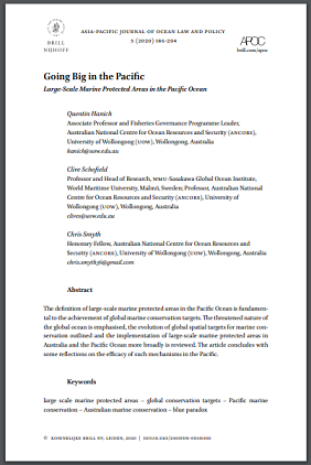 The definition of large-scale marine protected areas in the Pacific Ocean is fundamental to the achievement of global marine conservation targets. The threatened nature of the global ocean is emphasised, the evolution of global spatial targets for marine conservation outlined and the implementation of large-scale marine protected areas in Australia and the Pacific Ocean more broadly is reviewed. The article concludes with some reflections on the efficacy of such mechanisms in the Pacific.