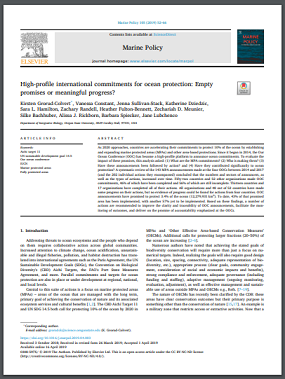 As 2020 approaches, countries are accelerating their commitments to protect 10% of the ocean by establishing and expanding marine protected areas (MPAs) and other area-based protections. Since it began in 2014, the Our Ocean Conference (OOC) has become a high-profile platform to announce ocean commitments. To evaluate the impact of these promises, this analysis asked: (1) What are the MPA commitments? (2) Who is making them? (3) Have these announcements been followed by action? and (4) Have they contributed significantly to ocean protection? A systematic review of the 143 MPA announcements made at the four OOCs between 2014 and 2017 (and the 202 individual actions they encompassed) concluded that the numbers and sectors of announcers, as well as the types of actions, increased over time. Fifty-two countries and 52 other organizations made OOC commitments, 46% of which have been completed and 56% of which are still incomplete. Thirteen countries and 17 organizations have completed all of their actions. All organizations and 48 out of 52 countries have made some progress on their actions, but no evidence of progress could be found for actions from four countries. OOC announcements have promised to protect 3.4% of the ocean (12,279,931 km2 ). To date, 43% of that promised area has been implemented, with another 57% yet to be implemented. Based on these findings, a number of actions are recommended to improve the clarity and traceability of OOC announcements, facilitate the monitoring of outcomes, and deliver on the promise of accountability emphasized at the OOCs.