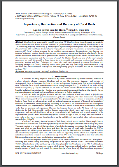 Coral reefs are an incredibly valuable ecosystem. Coral reefs are being degraded worldwide by several reasons such as; human activities, increases in cyclone intensity, climate warming, bleaching and so on. The increasing frequency and severity of anthropogenic impacts throughout the global ocean have an impact on the coral reefs. This worldwide decline of coral reefs calls for an urgent reassessment of current management practices. Coral reefs are important for our world for several reasons. Besides the fact that they are very beautiful and attract tourists, thus they function as a very important income, and they have other benefits for our marine environment and world such as symbioses and a source to finding medicine. In this review we point out the importance, destruction and the recovery of coral. %. Healthy Corals are one of the most valuable ecosystems on earth, the provide a huge income in environmental and economic services, such as coastal protection, tourism and food. Techniques to restore the coral reefs impacted by human disturbance are; salvaging sponges and corals, removing loose debris from the reef, rebuilding three-dimensional (3-D) structures onto leveled-scarified reef surfaces, and transplanting sponges and corals back on the cleared reef surfaces.