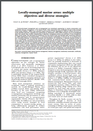 Community-based management and co-management are mainstream approaches to marine conservation and sustainable resource management. In the tropical Pacific, these approaches have proliferated through locally-managed marine areas (LMMAs). LMMAs have garnered support because of their adaptability to different contexts and focus on locally identified objectives, negotiated and implemented by stakeholders. While LMMA managers may be knowledgeable about their specific sites, broader understanding of objectives, management actions and outcomes of local management efforts remain limited. We interviewed 50 practitioners from the tropical Pacific and identified eight overarching objectives for LMMA establishment and implementation: (1) enhancing long-term sustainability of resource use; (2) increasing shortterm harvesting efficiency; (3) restoring biodiversity and ecosystems; (4) maintaining or restoring breeding biomass of fish or invertebrates; (5) enhancing the economy and livelihoods; (6) reinforcing customs; (7) asserting access and tenure rights; and (8) empowering communities. We reviewed outcomes for single or multiple objectives from published studies of LMMAs and go on to highlight synergies and trade-offs among objectives. The management actions or ʻtoolsʼ implemented for particular objectives broadly included: permanent closures; periodically-harvested closures; restrictions on gear, access or species; livelihood diversification strategies; and participatory and engagement processes. Although LMMAs are numerous and proliferating, we found relatively few cases in the tropical Pacific that adequately described how objectives and management tools were negotiated, reported the tools implemented, or empirically tested outcomes and seldom within a regional context. This paper provides some direction for addressing these research gaps.