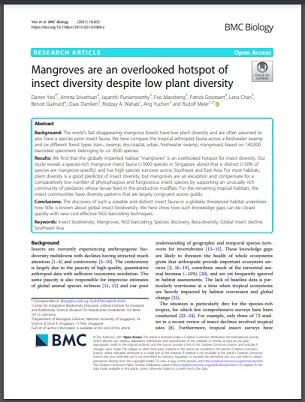 The world’s fast disappearing mangrove forests have low plant diversity and are often assumed to also have a species-poor insect fauna. We here compare the tropical arthropod fauna across a freshwater swamp and six different forest types (rain-, swamp, dry-coastal, urban, freshwater swamp, mangroves) based on 140,000 barcoded specimens belonging to ca. 8500 species. We find that the globally imperiled habitat “mangroves” is an overlooked hotspot for insect diversity. Our study reveals a species-rich mangrove insect fauna (>3000 species in Singapore alone) that is distinct (>50% of species are mangrove-specific) and has high species turnover across Southeast and East Asia. For most habitats, plant diversity is a good predictor of insect diversity, but mangroves are an exception and compensate for a comparatively low number of phytophagous and fungivorous insect species by supporting an unusually rich community of predators whose larvae feed in the productive mudflats. For the remaining tropical habitats, the insect communities have diversity patterns that are largely congruent across guilds. The discovery of such a sizeable and distinct insect fauna in a globally threatened habitat underlines how little is known about global insect biodiversity. We here show how such knowledge gaps can be closed quickly with new cost-effective NGS barcoding techniques.
