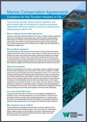 This summary provides resorts, tourism operators, and policy makers with an introduction to marine conservation agreements (MCA) and outlines a process for planning and implementing an MCA in Fiji.