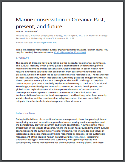 In this article, I explore the knowledge and values that allowed the people of Oceania to develop sustainable use of their marine resources, followed by the demise of these systems after western colonization and the breakdown of traditional societies. The current renaissance of customary stewardship has resulted in not only more effective management, but also a cultural reawakening in many of these island nations. The integration of customary and contemporary management regimes holds great promise for reducing reliance on foreign goods and services, while also improving social cohesion. Finally, I explore how the future management of the region's marine resources may be affected by cli- mate change and other global, as well as local stressors, and how these management regimes may be able to adapt to these changes.