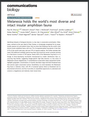 Identifying hotspots of biological diversity is a key step in conservation prioritisation. Melanesia—centred on the vast island of New Guinea—is increasingly recognised for its exceptionally species-rich and endemic biota. Here we show that Melanesia has the world’s most diverse insular amphibian fauna, with over 7% of recognised global frog species in less than 0.7% of the world’s land area, and over 97% of species endemic. We further estimate that nearly 200 additional candidate species have been discovered but remain unnamed, pointing to a total fauna in excess of 700 species. Nearly 60% of the Melanesian frog fauna is in a lineage of direct-developing microhylids characterised by smaller distributions than co-occurring frog families, suggesting lineage-specific high beta diversity is a key driver of Melanesian anuran megadiversity. A comprehensive conservation status assessment further highlights geographic concentrations of recently described range-restricted threatened taxa that warrant urgent conservation actions. Nonetheless, by world standards, the Melanesian frog fauna is relatively intact, with 6% of assessed species listed as threatened and no documented extinctions; and thus it provides an unparalleled opportunity to understand and conserve a megadiverse and relatively intact insular biota.