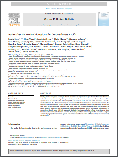 Existing marine bioregions covering the Pacific Ocean are conceptualised at spatial scales that are too broad for national marine spatial planning. Here, we developed the first combined oceanic and coastal marine bioregionalisation at national scales, delineating 262 deep-water and 103 reef-associated bioregions across the southwest Pacific. The deep-water bioregions were informed by thirty biophysical environmental variables. For reef-associated environments, records for 806 taxa at 7369 sites were used to predict the probability of observing taxa based on environmental variables. Both deep-water and reef-associated bioregions were defined with cluster analysis applied to the environmental variables and predicted species observation probabilities, respectively to classify areas with high taxonomic similarity. Local experts further refined the delineation of the bioregions at national scales for four countries. This work provides marine bioregions that enable the design of ecologically representative national systems of marine protected areas within offshore and inshore environments in the Pacific.