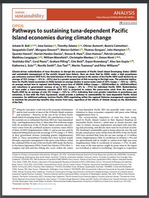 Climate-driven redistribution of tuna threatens to disrupt the economies of Pacific Small Island Developing States (SIDS) and sustainable management of the world’s largest tuna fishery. Here we show that by 2050, under a high greenhouse gas emissions scenario (RCP 8.5), the total biomass of three tuna species in the waters of ten Pacific SIDS could decline by an average of 13% (range =−5% to −20%) due to a greater proportion of fish occurring in the high seas. The potential implications for Pacific Island economies in 2050 include an average decline in purse-seine catch of 20% (range =−10% to −30%), an average annual loss in regional tuna-fishing access fees of US$90 million (range =−US$40 million to –US$140 million) and reductions in government revenue of up to 13% (range =−8% to −17%) for individual Pacific SIDS. Redistribution of tuna under a lower-emissions scenario (RCP 4.5) is projected to reduce the purse-seine catch from the waters of Pacific SIDS by an average of only 3% (range =−12% to +9%), indicating that even greater reductions in greenhouse gas emissions, in line with the Paris Agreement, would provide a pathway to sustainability for tuna-dependent Pacific Island economies. An additional pathway involves Pacific SIDS negotiating within the regional fisheries management organization to maintain the present-day benefits they receive from tuna, regardless of the effects of climate change on the distribution of the fish.