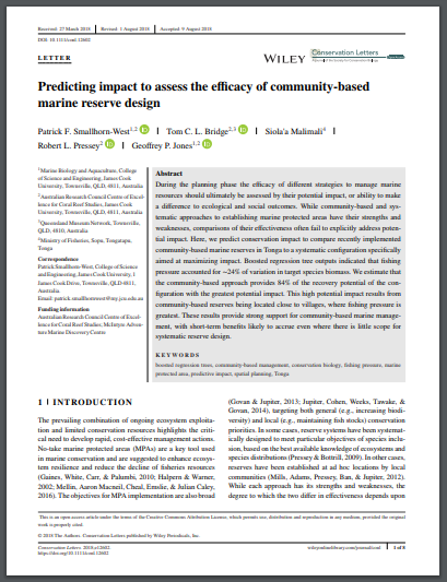 During the planning phase the efficacy of different strategies to manage marine resources should ultimately be assessed by their potential impact, or ability to make a difference to ecological and social outcomes. While community-based and systematic approaches to establishing marine protected areas have their strengths and weaknesses, comparisons of their effectiveness often fail to explicitly address potential impact. Here, we predict conservation impact to compare recently implemented community-based marine reserves in Tonga to a systematic configuration specifically aimed at maximizing impact. Boosted regression tree outputs indicated that fishing pressure accounted for ∼24% of variation in target species biomass. We estimate that the community-based approach provides 84% of the recovery potential of the configuration with the greatest potential impact. This high potential impact results from community-based reserves being located close to villages, where fishing pressure is greatest. These results provide strong support for community-based marine management, with short-term benefits likely to accrue even where there is little scope for systematic reserve design. Here, we predict the potential conservation impact, measured as the recovery of target species biomass, of alternative configurations of no-take MPAs in the Vava'u island group of Tonga.