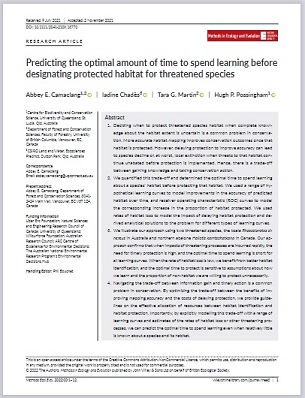 Deciding when to protect threatened species habitat when complete knowledge about the habitat extent is uncertain is a common problem in conservation. More accurate habitat mapping improves conservation outcomes once that habitat is protected. However, delaying protection to improve accuracy can lead to species decline or, at worst, local extinction when threats to that habitat continue unabated before protection is implemented. Hence, there is a trade-off between gaining knowledge and taking conservation action. We quantified this trade-off and determined the optimal time to spend learning about a species' habitat before protecting that habitat. We used a range of hypothetical learning curves to model improvements in the accuracy of predicted habitat over time, and receiver operating characteristic (ROC) curves to model the corresponding increase in the proportion of habitat protected. We used rates of habitat loss to model the impact of delaying habitat protection and de-rived analytical solutions to the problem for different types of learning curves. We illustrate our approach using two threatened species, the koala Phascolarctos cinereus in Australia and northern abalone Haliotis kamtschatkana in Canada. Our approach confirms that when impacts of threatening processes are incurred rapidly, the need for timely protection is high, and the optimal time to spend learning is short for all learning curves. When the rate of habitat loss is low, we benefit from better habitat identification, and the optimal time to protect is sensitive to assumptions about how we learn and the proportion of non- habitat we are willing to protect unnecessarily. Navigating the trade-off between information gain and timely action is a common problem in conservation. By optimizing the trade-off between the benefits of improving mapping accuracy and the costs of delaying protection, we provide guide-lines on the effective allocation of resources between habitat identification and habitat protection. Importantly, by explicitly modelling this trade-off with a range of learning curves and estimates of the rates of habitat loss or other threatening processes, we can predict the optimal time to spend learning even when relatively little is known about a species and its habitat.