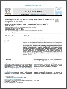 The question of how to efficiently and effectively manage ocean resources in a sustainable way has reached the forefront of discussion at an international level, but women's contributions to this process have been underestimated or unrecognized. Inclusive management plays a major role in the effective creation, use and adoption of environmental governance, necessitating efforts to measure, monitor and advance inclusivity. In many Pacific island states, there is a lack of disaggregated data collection and management to assist reliable and liable gender-responsive decision-making by national and regional authorities. This lack of information leads to unquantified female contributions and unexplored potential for women to actively contribute to sustainable ocean management as traditional leaders, researchers or science-based managers and in accordance with traditional customs, cultures and processes. This paper examines the contribution of gender-disaggregated data in both (1) effective management of natural resources and (2) measurement and monitoring of the active involvement of women in ocean management. We seek to shift the question from simply “(How) are oceans used by women?” to “How can we build a clear path towards inclusive oceans management using science?”, drawing data mainly from gender and ocean management practices in Pacific Small Island Developing States. This work also seeks to ground in reality the increasing national and international evocations about social equity and avoidance of gender discrimination. Given the existing relationships of Pacific peoples with the ocean and the emerging status of ocean science-based governance, wider integration of science and women in marine management can make an interesting and positive impact in this region.