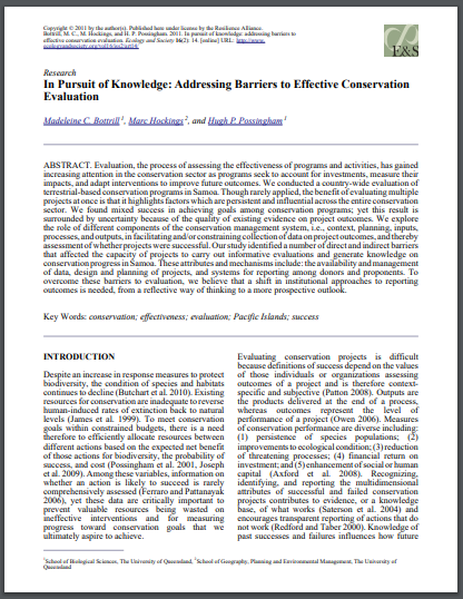 Evaluation, the process of assessing the effectiveness of programs and activities, has gained increasing attention in the conservation sector as programs seek to account for investments, measure their impacts, and adapt interventions to improve future outcomes. We conducted a country-wide evaluation of terrestrial-based conservation programs in Samoa. Though rarely applied, the benefit of evaluating multiple projects at once is that it highlights factors which are persistent and influential across the entire conservation sector. We found mixed success in achieving goals among conservation programs; yet this result is surrounded by uncertainty because of the quality of existing evidence on project outcomes. We explore the role of different components of the conservation management system, i.e., context, planning, inputs, processes, and outputs, in facilitating and/or constraining collection of data on project outcomes, and thereby assessment of whether projects were successful. Our study identified a number of direct and indirect barriers that affected the capacity of projects to carry out informative evaluations and generate knowledge on conservation progress in Samoa. These attributes and mechanisms include: the availability and management of data, design and planning of projects, and systems for reporting among donors and proponents. To overcome these barriers to evaluation, we believe that a shift in institutional approaches to reporting outcomes is needed, from a reflective way of thinking to a more prospective outlook