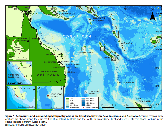 Knowledge of the habitat use and migration patterns of large sharks is important for assessing the effectiveness of large predator Marine Protected Areas (MPAs), vulnerability to fisheries and environmental influences, and management of shark–human interactions. Here we compare movement, reef-fidelity, and ocean migration for tiger sharks, Galeocerdo cuvier, across the Coral Sea, with an emphasis on New Caledonia. Thirty-three tiger sharks (1.54 to 3.9 m total length) were tagged with passive acoustic transmitters and their localised movements monitored on receiver arrays in New Caledonia, the Chesterfield and Lord Howe Islands in the Coral Sea, and the east coast of Queensland, Australia. Satellite tags were also used to determine habitat use and movements among habitats across the Coral Sea. Sub-adults and one male adult tiger shark displayed year-round residency in the Chesterfields with two females tagged in the Chesterfields and detected on the Great Barrier Reef, Australia, after 591 and 842 days respectively. In coastal barrier reefs, tiger sharks were transient at acoustic arrays and each individual demonstrated a unique pattern of occurrence. From 2009 to 2013, fourteen sharks with satellite and acoustic tags undertook wide-ranging movements up to 1114 km across the Coral Sea with eight detected back on acoustic arrays up to 405 days after being tagged. Tiger sharks dove 1136 m and utilised three-dimensional activity spaces averaged at 2360 km3. The Chesterfield Islands appear to be important habitat for sub-adults and adult male tiger sharks. Management strategies need to consider the wide-ranging movements of large (sub-adult and adult) male and