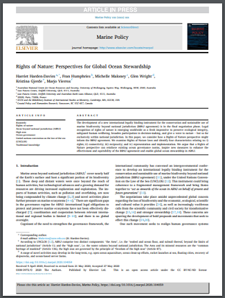 The development of a new international legally binding instrument for the conservation and sustainable use of marine biodiversity beyond national jurisdiction (BBNJ agreement) is in the final negotiation phase. Legal recognition of rights of nature is emerging worldwide as a fresh imperative to preserve ecological integrity, safeguard human wellbeing, broaden participation in decision-making, and give a voice to nature – but so far exclusively within national jurisdiction. In this paper, we consider how a Rights of Nature perspective might inform the BBNJ agreement. We examine Rights of Nature laws and identify four characteristics relating to: i) rights; ii) connectivity; iii) reciprocity; and iv) representation and implementation. We argue that a Rights of Nature perspective can reinforce existing ocean governance norms, inspire new measures to enhance the effectiveness and equitability of the BBNJ agreement and enable global ocean stewardship in ABNJ.