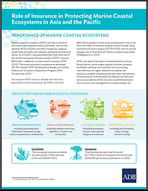 Marine coastal ecosystems (MCEs) provide a myriad of services on which governments, businesses, and society depend. MCEs include coral reefs, mangroves, seagrass, oyster beds and reefs, salt marshes, and sandy beaches and dunes. As of 2020, it was estimated that more than half of the world’s total gross domestic product (GDP)—around $44 trillion—depends on nature and its services (WEF 2020). The ocean economy contributes an estimated 3%–5% of global GDP (Spalding, Brumbaugh, and Landis; Millennium Ecosystem Assessment Program 2005; Ferrario et al. 2014). An important MCE service is disaster risk reduction, particularly in the coastal areas. By 2050, more than 800 million people in those areas are expected to be at risk from the impact of extreme weather events through rising sea levels and storm surges (UCCRN 2018), with an annual average cost of more than $1 trillion to coastal urban areas (Hallegatte et al. 2013). MCEs can reduce the impact of natural hazards, such as floods, storms, storm surges, tropical cyclones, tsunamis, landslides, and long-term sea-level rise, by providing cost-effective, no-regret solutions for disaster risk reduction, possibly complemented with other interventions for that purpose. Unfortunately, the disaster risk reduction services provided by MCEs are rarely quantified and taken into account in the management of coastal disaster risk.