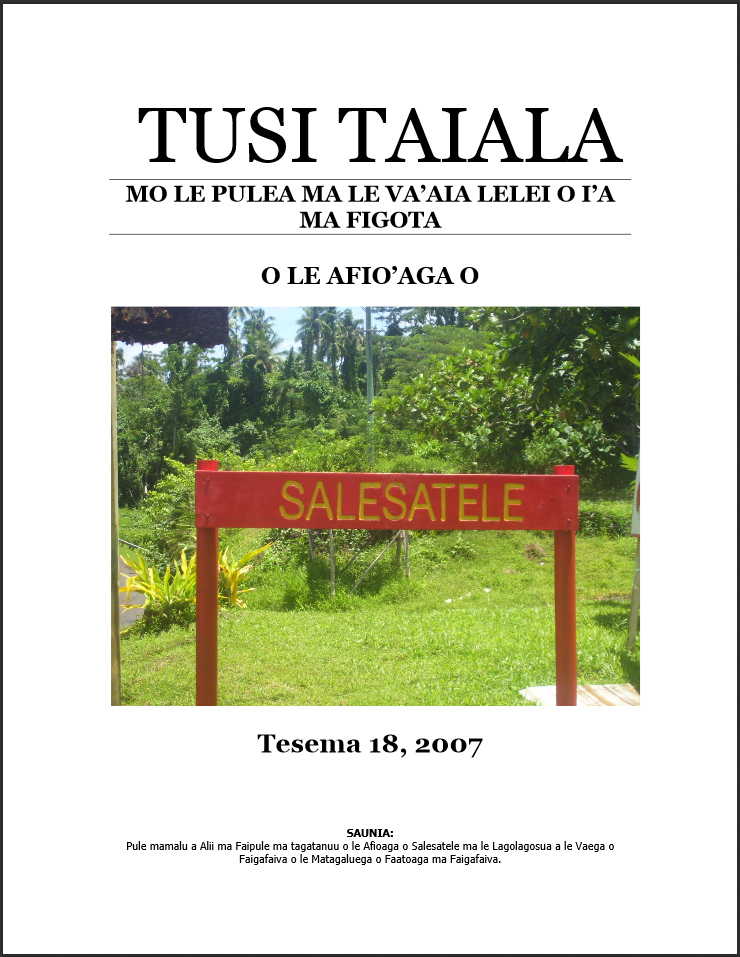 O lenei tapenaga sa saunia lava e le Fono a Alii ma Faipule ma tagatanuu o Salesatele faatasi ai ma ni fautuaga ma le lagolagosua a le Ofisa o Faigafaiva o le Matagaluega o Faatoaga ma Faigafaiva.
