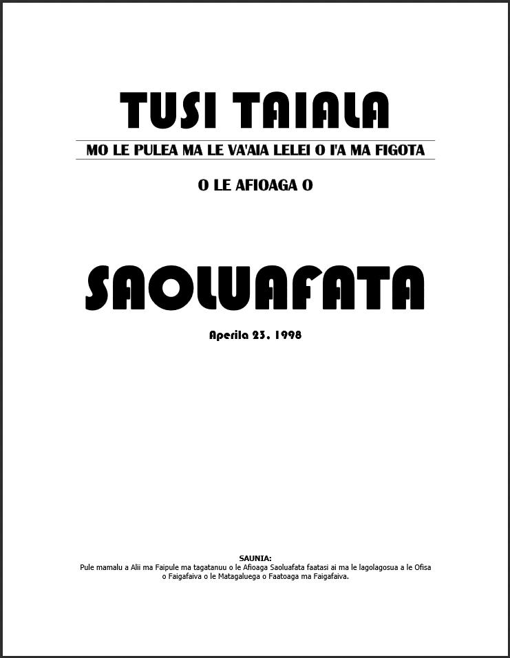 nuu e pei o le vasega o matai, tina ma taulelea. O nei fefaasoaaiga e faailoa mai ai faafitauli o loo faafeagai ma le gataifale o le afioaga. E talanoaina foi aafiaga ma mafuaaga o nei faafitauli ma soalaupule ai ni fofo. Ma sa faapea loa ona soalaupule ai e Alii ma Faipule,