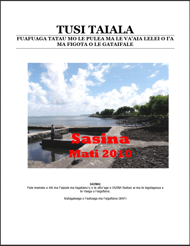 O fuafuaga faataatitia i lenei Tusi Taiala e unaia ai le pulea tatau ma le vaaia lelei o le faaaogaina o le tamaoaiga o le gataifale o le afioaga o SASINA, i Savaii.