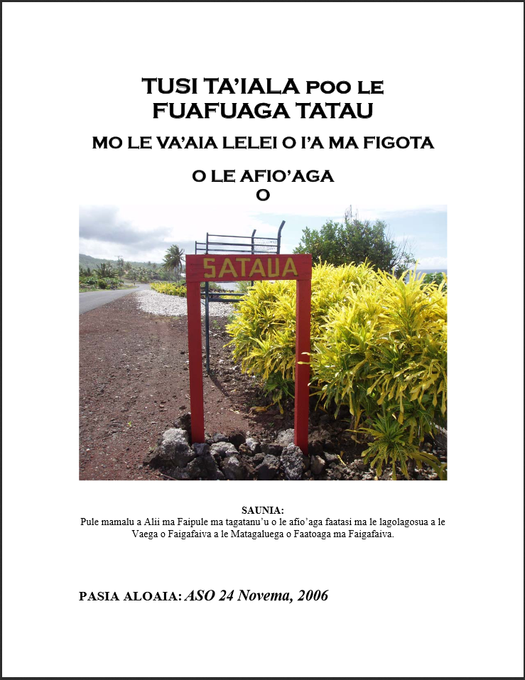 O le tausaga 1958 e tusa ai ma faamatalaga tusitusia ma molimau a le afio’aga o Sataua sa faavae ai ona tulafono na fausia ma saunia e tuaa ua fai i lagi le folauga, ma o loo faaauauina pea e oo mai i le taimi nei e faasaina ai faigafaiva le talafeagai ona faatinoina i o latou gataifale. Sa faailoa mai foi e le Pule mamalu a Alii ma Faipule le tusi ua maea tamauina ai nei tulafono uma a le afio’aga. E le gata i lea sa molimauina foi e nisi o sui ua maea faasalalauina tulafono a le afio’aga i le Aso 10 Setema 1985 i luga ole alaleo (leitio) a Samoa. I le taimi nei ua matua faamalosia foi le tulafono e faasaina ai tagata mai isi afio’aga ona toe fagotaina gataifale o lenei afio’aga faatasi ma le lama moliuila. Peitai, o le auai o le afioaga i le polokalame lenei, e faamautuina ai le faamalosia o nei tulafono ma e mafai ai ona faasalaina i tulafono o faigafaiva a le Malo o Samoa se tasi na te le usitaia faasalaga faa-le-nuu ua tamauinai totonu o lenei tusi taiala poo le fuafuaga tatau mo le vaaia lelei o i’a ma figota.