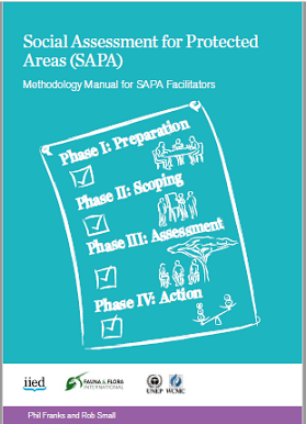 This manual provides detailed guidance for assessing the social impacts – benefits and costs – of protected areas (PAs) and related conservation and development activities, at the local level using the relatively simple and low cost Social Assessment for Protected Areas (SAPA) methodology. SAPA can be used with PAs of any kind, including PAs managed and governed by government agencies, communities and the private sector. It is a multi-stakeholder assessment for use by PA managers, communities living within and around the PA, other local level stakeholders, and supporting organisations at national level, to help increase and more equitably share positive social impacts, and reduce negative social impacts. Our assumption in developing the SAPA methodology is that the assessment will be proposed, planned and facilitated by these site-level users and this methodology manual is written for these users. In most cases there will be a need for technical support from an organisation at national or state level with social research expertise – for example an NGO, university or consultancy – especially for the household survey, but there should be no need for international consultants. The methodology uses a combination of i) community workshops to identify significant social impacts, ii) a short household survey to explore these impacts and related governance issues in more depth, and iii) stakeholder workshops to validate the survey results, explore other key issues and generate recommendations for action.