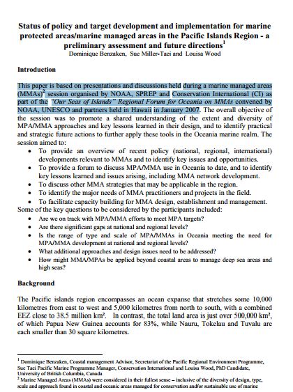 Benzaken, D., Miller-Taei, S.,  Wood, L. 2007. Status of Policy and Target Development and Implementation for Marine Protected Areas/Marine Managed Areas in the Pacific Islands Region - A Preliminary Assessment and Future Directions
