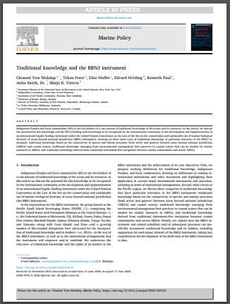 Indigenous Peoples and local communities (IPLCs) are the holders of a vast amount of traditional knowledge of the ocean and its resources. In this article, we discuss the potential for this knowledge and the IPLCs holding such knowledge to be recognized by the international community in the development and implementation of an international legally binding instrument under the United Nations Convention on the Law of the Sea on the conservation and sustainable use of marine biological diversity of areas beyond national jurisdiction (BBNJ instrument), drawing on three main types of traditional knowledge of particular relevance to the BBNJ instrument: traditional knowledge based on the connectivity of species and marine processes (both active and passive) between areas beyond national jurisdiction (ABNJs) and coastal waters; traditional knowledge emerging from environmental management best practices in coastal waters that can be models for similar measures in ABNJs; and traditional knowledge derived from traditional instrument-free navigation between coastal communities and across ABNJs.