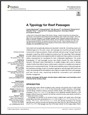 Coral reefs host exceptionally diverse and abundant marine life. Connecting coasts and sheltered lagoons to the open ocean, reef passages are important yet poorly studied components of these ecosystems. Abiotic and biotic elements ‘pass’ through these reef passages, supporting critical ecological processes (e.g. fish spawning). Reef passages provide multiple social and ecological benefits for islands and their peoples, but are so far neither characterized nor recognized for their multifaceted significance. This study investigated 113 reef passages across nine Pacific islands (Fiji, New Caledonia, Vanuatu). GIS-based visual interpretations of satellite imagery were used to develop criteria to define three distinct types, mainly based on distance to coastline and presence/absence of an enclosed water body. The discussion identifies ways to refine and augment this preliminary typology as part of a research agenda for reef passages. With these next steps, this typology will be extendable to other regions to better document reef passages and their various roles, supporting biodiversity conservation and sustainable fisheries management.
