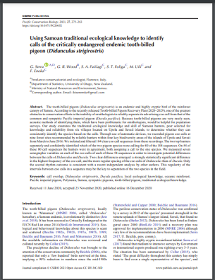 The tooth-billed pigeon (Didunculus strigirostris) is an endemic and highly cryptic bird of the rainforest canopy of Samoa. According to the recently released Tooth-billed Pigeon Recovery Plan (2020–2029), one of the greatest obstacles to conservation efforts is the inability of ornithologists to reliably separate its advertising coo call from that of the common and sympatric Pacific imperial pigeon (Ducula pacifica). Because tooth-billed pigeons are very rarely seen, acoustic methods of identifying them, which have been problematic for ornithologists, would be helpful for population surveys. Our study examines the traditional ecological knowledge and skill of Samoan hunters, peer selected for knowledge and reliability from six villages located on Upolu and Savaii islands, to determine whether they can consistently identify the species based on the calls. Through use of automatic devices, we recorded pigeon coo calls at nine forest sites recommended by reliable hunters within four key biodiversity areas of the islands of Upolu and Savaii from March to June 2016. We isolated and filtered 104 clear coo call sequences from these recordings. The two top hunters separately and confidently identified which of the two pigeon species were calling for 80 of the 104 sequences. On 54 of these 80 call sequences the hunters were in agreement, both assigning a call to the one species. We measured seven sonographic variables on each of the coo calls of each of these 54 sequences in order to investigate potential differences between the calls of Didunculus and Ducula. Two clear differences emerged: a strongly statistically significant difference in the highest frequency of the coo call, and the more regular spacing of the coo calls of Didunculus than of Ducula. Only the second rhythm outcome is consistent with a recent independent analysis by other authors. This regularity of the intervals between coo calls in a sequence may be the key to separation of the two species in the field.