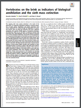 The ongoing sixth mass species extinction is the result of the destruction of component populations leading to eventual extirpation of entire species. Populations and species extinctions have severe implications for society through the degradation of ecosystem services. Here we assess the extinction crisis from a different perspective. We examine 29,400 species of terrestrial vertebrates, and determine which are on the brink of extinction because they have fewer than 1,000 individuals. There are 515 species on the brink (1.7% of the evaluated vertebrates). Around 94% of the populations of 77 mammal and bird species on the brink have been lost in the last century. Assuming all species on the brink have similar trends, more than 237,000 populations of those species have vanished since 1900. We conclude the human-caused sixth mass extinction is likely accelerating for several reasons. First, many of the species that have been driven to the brink will likely become extinct soon. Second, the distribution of those species highly coincides with hundreds of other endangered species, surviving in regions with high human impacts, suggesting ongoing regional biodiversity collapses. Third, close ecological interactions of species on the brink tend to move other species toward annihilation when they disappear—extinction breeds extinctions. Finally, human pressures on the biosphere are growing rapidly, and a recent example is the current coronavirus disease 2019 (Covid-19) pandemic, linked to wildlife trade. Our results reemphasize the extreme urgency of taking much-expanded worldwide actions to save wild species and humanity’s crucial life-support systems from this existential threat.