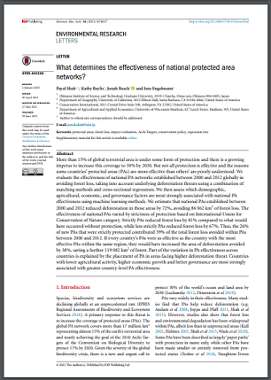 More than 15% of global terrestrial area is under some form of protection and there is a growing impetus to increase this coverage to 30% by 2030. But not all protection is effective and the reasons some countries’ protected areas (PAs) are more effective than others’ are poorly understood. We evaluate the effectiveness of national PA networks established between 2000 and 2012 globally in avoiding forest loss, taking into account underlying deforestation threats using a combination of matching methods and cross-sectional regressions. We then assess which demographic, agricultural, economic, and governance factors are most strongly associated with national PA effectiveness using machine learning methods. We estimate that national PAs established between 2000 and 2012 reduced deforestation in those areas by 72%, avoiding 86 062 km2 of forest loss. The effectiveness of national PAs varied by strictness of protection based on International Union for Conservation of Nature category. Strictly PAs reduced forest loss by 81% compared to what would have occurred without protection, while less strictly PAs reduced forest loss by 67%. Thus, the 26% of new PAs that were strictly protected contributed 39% of the total forest loss avoided within PAs between 2000 and 2012. If every country’s PAs were as effective as the country with the most effective PAs within the same region, they would have increased the area of deforestation avoided by 38%, saving a further 119 082 km2 of forest. Part of the variation in PA effectiveness across countries is explained by the placement of PA in areas facing higher deforestation threat. Countries with lower agricultural activity, higher economic growth and better governance are most strongly associated with greater country-level PA effectiveness.