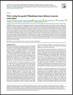 We are in a period of unprecedented growth in conservation philanthropy. How will this influx of private funding affect conservation agendas? Inspired by a collaborative research co-design process, this paper addresses questions about how foundations influence conservation agendas in the places they work. We draw from a case study of the world’s largest philanthropic funder of marine conservation, the David and Lucile Packard Foundation and their 20 years of investment in marine conservation in Palau and Fiji. Conservation practitioners in both countries universally agreed that the Packard Foundation had a significant and positive influence on the agenda, which they attribute to both how the foundation worked and what they chose to fund. Specifically, our study reveals how the Packard Foundation shaped conservation agendas in Palau and Fiji in partnership with its grantees through a grant-making process characterized by relationship building, collaborative decision making, convening and promoting of collective action, flexibility, and long-term funding. Packard’s approach was often identified as unique, and contrasted with numerous other donors, including foundations and other types of donors, who use a more top-down approach. By describing a relative success story in how philanthropic foundations can work with conservation practitioners to co-design a shared conservation agenda, our work provides timely guidance for donors and practitioners.